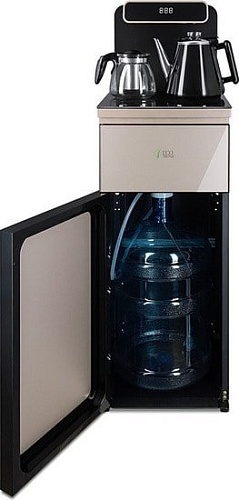| Информация | Напольный кулер с чайным столиком. Пульт дистанционного управления. Нижняя загрузка бутыли. Два чайника – для кипячения (изотермический) и заварочный. Без охлаждения, только нагрев. Нагрев воды в чайнике до 100°С. Шкафчик для хранения.Многофункциональный тиабар с пультом дистанционного управления, позволяет управлять аппаратом как на удаленном расстоянии до 7 метров, так и с помощью сенсорной панели управления на русском языке.Функция регулировки температуры воды в чайнике позволяет задавать нужную температуру воды в диапазоне от 40°С до 100°С.Функция регулировки времени подачи воды в чайник – возможность задать время подачи воды в чайник (от 18 до 50 сек).Информационный дисплей в верхней части совмещен с кранами подачи воды. Два чайника, для кипячения и заварочный. Заварочному чайнику можно включить режим постоянного подогрева (~ до 60°С). Чайник кипячения изотермический – меньше греется, лучше сохраняет температуру. Подача воды в него возможна без открытия крышки. Нагрев воды в чайнике включается вручную. Автоотключение нагрева при температуре 100°С.В верхней части корпуса есть шкафчик для хранения продуктов. Корпус черного цвета, передняя панель стеклянная, золотистого цвета. Поверхность чайного столика черная, чайники и кран подачи воды черные с серебристой отделкой. |
