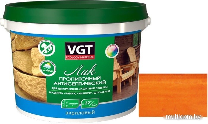 | Информация | Любая деревянная поверхность нуждается в защите. Постоянное воздействие влаги и других негативных факторов вызывает разбухание волокон, деформацию изделия, развитие гнили и грибков. Акриловый лак для дерева от ТМ VGT предназначен для глубокой пропитки и защиты деревянных поверхностей (кроме полов) от гниения. Его используют также для декоративной отделки и защиты кирпичных, бетонных и других минеральных оснований, а также природного и искусственного камня от грибков, водорослей, плесени. Лак может применяться для наружных и внутренних работ по дереву во всех типах зданий и сооружений (А-В), в т. ч. для которых предусмотрен режим влажной дезинфекции. Основные преимущества лака для дерева: Образует прозрачную, эластичную, прочную пленку. Лак устойчив к трещинообразованию даже при небольших деформациях основания. Имеет большую глубину проникновения в структуру дерева, что обеспечивает более длительную защиту от гниения. Является универсальным для наружных и внутренних работ. Сохраняет насыщенность цвета декоративного покрытия или самой древесины. Состав изготавливается с УФ-фильтром. Выпускается в широкой цветовой гамме. Лаки для дерева предложены в 12 цветах. Отлично пропускает пар, не позволяя влаге задерживаться в волокнах. Образуется «дышащее» покрытие, которое способствует поддержанию комфортного микроклимата в помещениях. |
