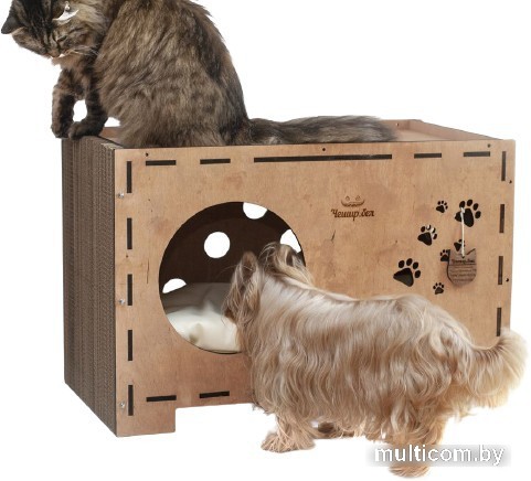 | Информация | Домик Сундук разработан с учетом потребностей домохозяйств, в которых обитает пара питомцев. Особенность конструкции в том числе позволяет разрешать такую проблему как кормление кошки на верхней части, так и пребывание маленькой собачки в нижней части конструкции. |
