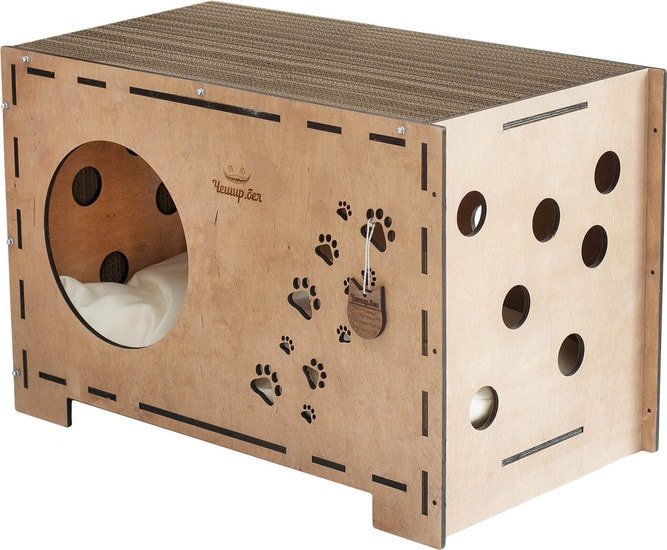 | Информация | Домик Сундук разработан с учетом потребностей домохозяйств, в которых обитает пара питомцев. Особенность конструкции в том числе позволяет разрешать такую проблему как кормление кошки на верхней части, так и пребывание маленькой собачки в нижней части конструкции. |