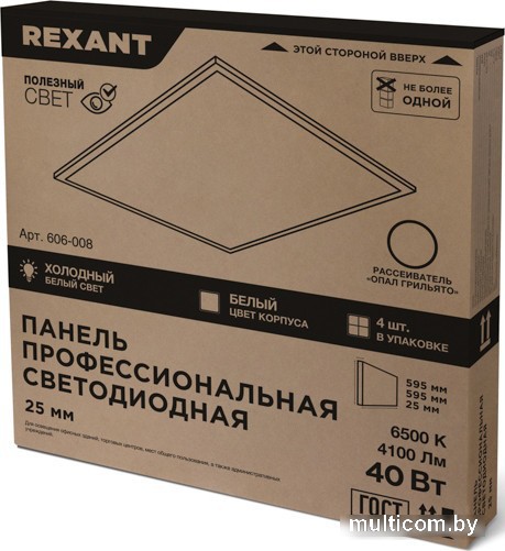 Информация | Профессиональная светодиодная панель REXANT представляет собой идеальное решение для освещения офисных зданий, торговых центров, мест общего пользования, а также административных учреждений. Устройство легко устанавливается как накладным, так и подвесным способом. Оснащено встроенным драйвером. Благодаря наличию электромагнитной совместимости и равномерному освещению без пульсации панель безопасна для зрения. Отличается высоким уровнем светового потока и низким энергопотреблением. Обладает высокой энергоэффективностью, износоустойчивостью и долгим сроком службы 30 000 ч. Создает в помещениях комфортную и уютную атмосферу. |