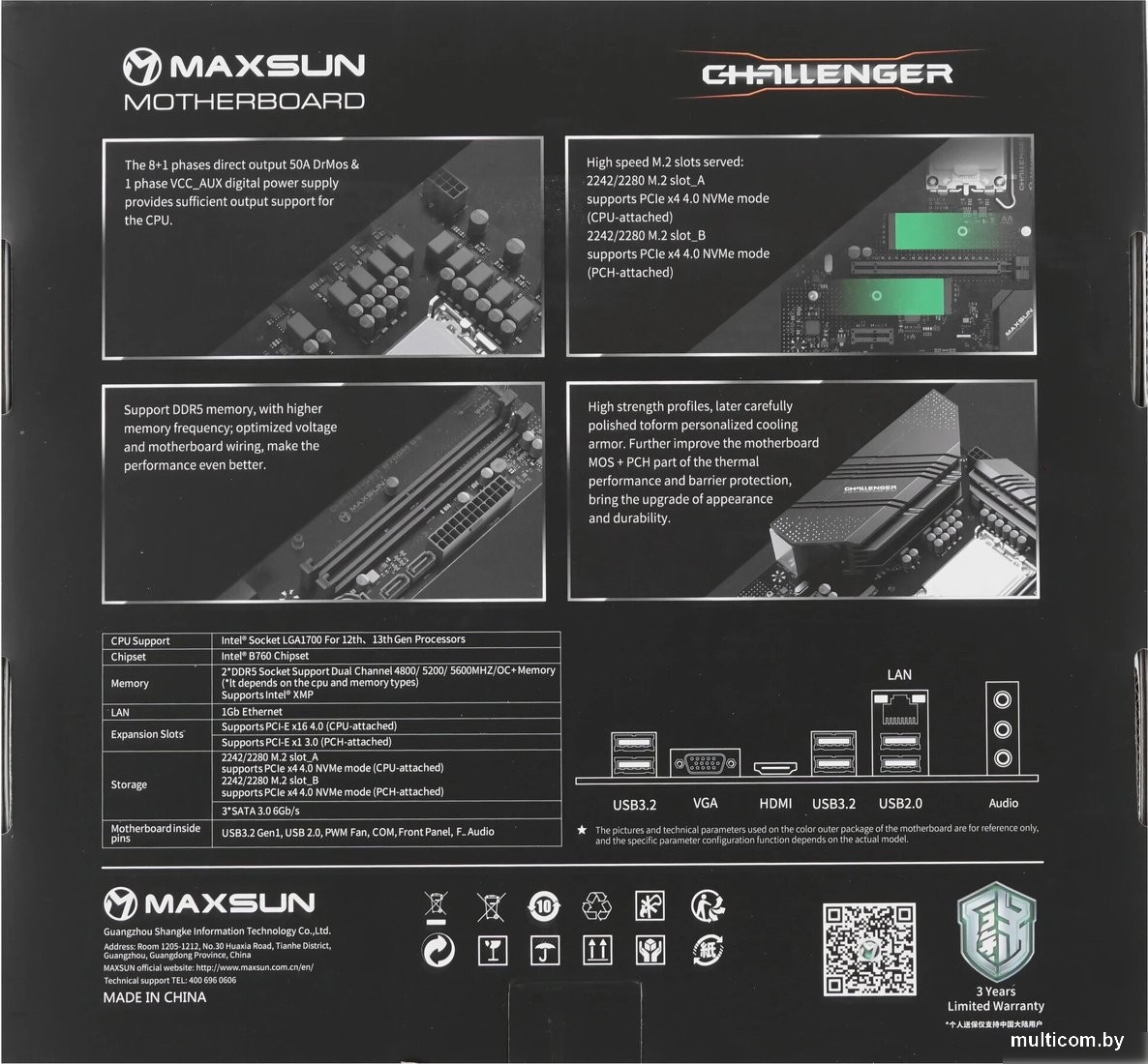 | Информация | - Данная материнская плата формата mATX построена на чипсете Intel B760 и предназначена для процессоров Intel 12-го и 13-го поколения с сокетом LGA1700. Плата поддерживает установку до 96 ГБ оперативной памяти DDR5 с максимальной частотой 4800 МГц и работает в двухканальном режиме, что обеспечивает отличную производительность для современных задач. - Для хранения данных предусмотрены два слота M.2 4.0 (только для SSD 2242/2280 с поддержкой PCIe X4/X2) и три порта SATA 3.0, что позволяет собрать быстрый и объемный дисковый массив. Поддержка RAID отсутствует, однако базовые возможности хранения полностью реализованы. - Плата оснащена одним слотом PCI Express x16 версии 4.0 и одним слотом PCI Express x1 версии 3.0, что позволяет устанавливать современные видеокарты и дополнительные платы расширения. Для сетевых подключений предусмотрен гигабитный Ethernet (1x 1 Гбит/с), а также встроенные модули Wi-Fi 6 (802.11ax) и Bluetooth. - На задней панели располагаются HDMI 1.4, VGA, четыре USB 3.2 Gen1, два USB 2.0, три аудиоразъема (3.5 мм), что обеспечивает широкие возможности для подключения внешних устройств и периферии. Встроенный аудиокодек Realtek ALC897 обеспечивает достойное качество звука, а наличие разъемов ARGB и RGB позволяет подключать и настраивать подсветку компонентов системы. |