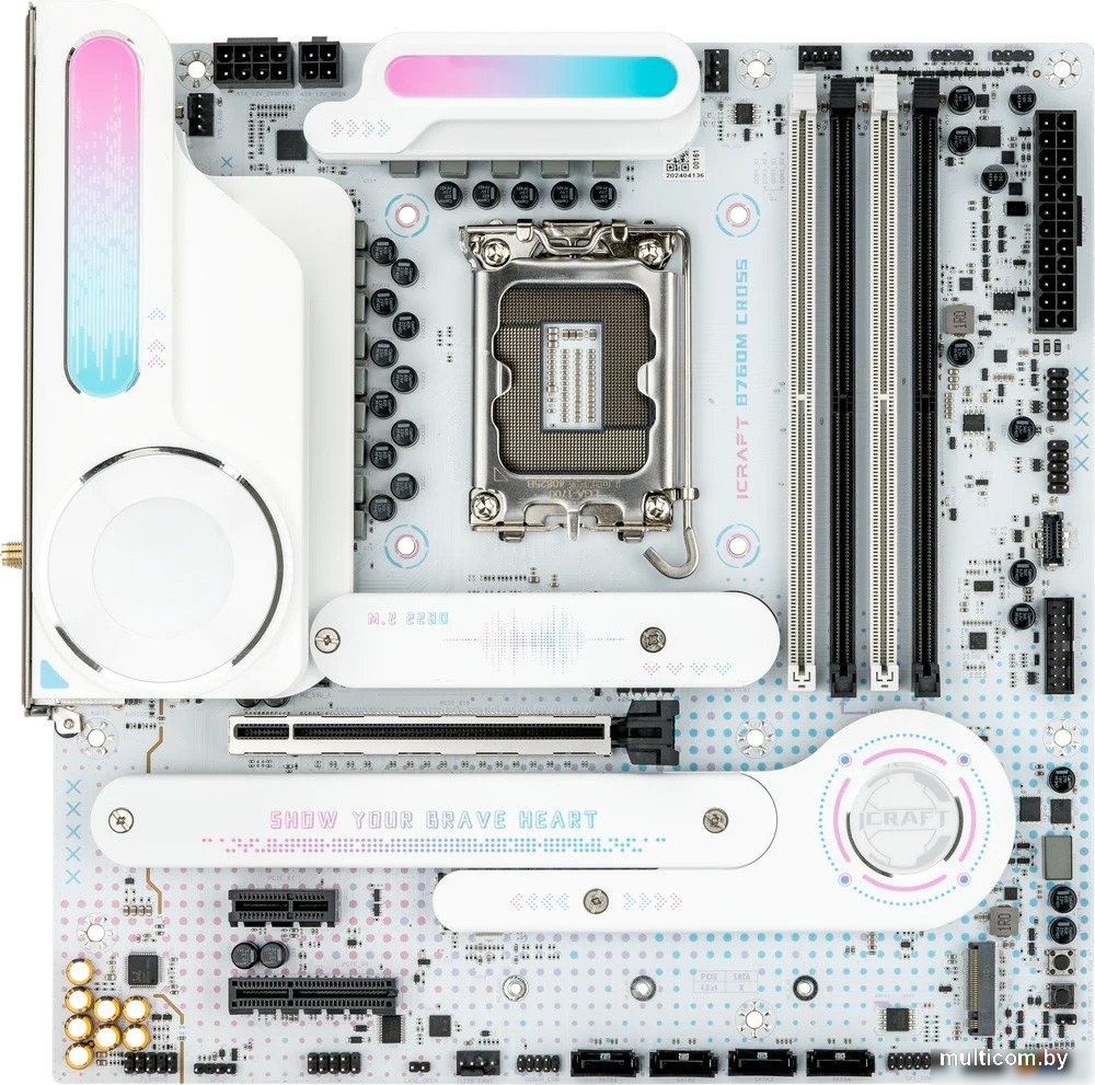 | Информация | -Материнская плата iCraft B760M CROSS поддерживает процессоры Intel 12-го, 13-го и 14-го поколений, а также оснащена сокетом LGA1700 и чипсетом Intel B760, что обеспечивает высокую производительность для современных задач. -Эта модель имеет форм-фактор mATX и выполнена в белом цвете с поддержкой RGB-подсветки. Она поддерживает до 192 ГБ оперативной памяти DDR5 с максимальной частотой 7600 МГц и двухканальным режимом работы. -Материнская плата оснащена разнообразными интерфейсами, включая три слота M.2 с поддержкой PCIe 4.0, 4 разъема SATA 3.0, а также встроенные модули Wi-Fi 6E и Bluetooth 5.3. Задняя панель предлагает современные порты USB, включая USB 3.2 Gen 2x2 (20 Гбит/с), а также видеовыходы HDMI и DisplayPort. -Дополнительные функции включают улучшенное охлаждение фаз питания, встроенный звук Realtek ALC897 с поддержкой 7.1-канального аудио, а также высококачественные разъемы для подключения вентиляторов, подсветки и периферийных устройств. |