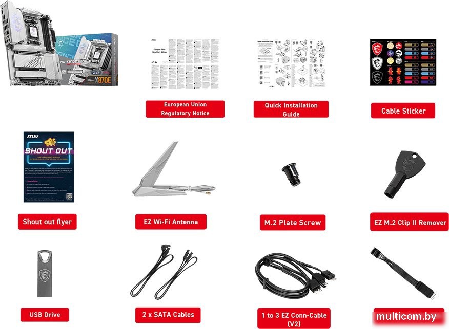 | Комплектация | - два кабеля SATA - EZ Wi-Fi антенна - EZ кабель передней панели - 1-3 EZ кабель - винт M.2 - EZ M.2 Clip II экстрактор - набор стикеров - USB Flash накопитель - документация |