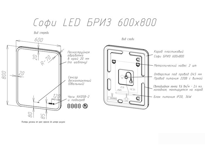 Информация | Led-зеркало с функцией подогрева, часы, датчик температуры. Бесконтактный датчик вкл/выкл. Быстрый монтаж. |