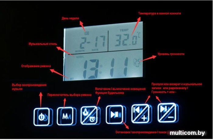 | Функциональные особенности | часы, индикация температуры, подогрев (антизапотеватель), музыкальная система, сенсорное управление, bluetooth (+ дата, таймер) |