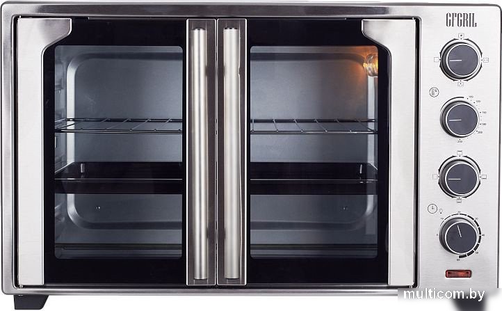 | Информация | Электрическая многофункциональная мини-печь GFGRIL GFO-90 имеет инновационный дизайн дверец «French door» - удобное открывание дверок одним касанием. Печь подойдет всем, кто не хочет тратить много времени на приготовление любимых блюд, но при этом хочет питаться вкусно и полезно. Электрическая мини-печь - это духовой шкаф и печь одновременно, которая дает возможность запечь или зажарить разнообразные блюда. Если у Вас уже есть плита или варочная панель, то печь с конвекцией составит к ним классическое дополнение. Благодаря вместительной внутренней камере объемом 60 литров мини-печь может стать полноценной альтернативой духовке и позволит приготовить объемные блюда, а также готовить на нескольких уровнях одновременно. Вы сможете приготовить различные блюда для всей семьи или для большой компании – курицу или рыбу целиком, большую пиццу, большие куски мяса, разнообразную выпечку. Два нагревательных элемента общей мощностью 2000 Вт обеспечивают быстрый нагрев от 100 до 250°С. Вы можете использовать нагревательные элементы в различных вариантах: Нагрев только сверху - работает только верхний нагревательный элемент. Используется для приготовления или придания готовому блюду аппетитной хрустящей корочки. Также подходит для разогрева небольших блюд. Нагрев только снизу - работает только нижний нагревательный элемент. Используется для блюд, требующих длительного и медленного пропекания. Так же подходит для финальной стадии приготовления, чтобы обеспечить наилучшее пропекание нижней части блюда. Верхний и Нижний нагрев - работают два нагревательных элемента. Используется для равномерного выпекания и жарки на одном уровне. Мини-печь электрическая снабжена функцией конвекции, а также вертелом, что позволит блюду равномерно приготовиться со всех сторон и обеспечит хрустящую корочку. Духовая печь GFGRIL GFO-90 имеет несколько режимов приготовления: Конвекция – благодаря встроенному вентилятору горячий воздух перемешивается, обеспечивая равномерное прогревание всего объема, что позволяет готовить пищу сразу на нескольких противнях. Вертел - благодаря вращению вертела достигается равномерное прожаривание мяса, рыбы или птицы. Вертел + конвекция - сочетание вертела и конвекционного вентилятора помогут при приготовлении объёмных блюд. Вы можете с легкостью выбрать один из 6 режимов приготовления, установить температуру от 100 до 250°С и время приготовления от 5 до 60 минут при помощи механических поворотных регуляторов. Встроенная подсветка позволит наблюдать за процессом, не открывая дверцу шкафа, что сохранит температуру внутри. По истечении установленного времени таймер оповестит Вас об окончании процесса приготовления звуковым сигналом. Электрическая печь с конвекцией поставляется в комплекте с решеткой, большим противнем, вертелом, шашлычницей, держателем для вертела, а также держателем с зажимом для безопасного и лёгкого извлечения противня/решетки из печи. Духовка электрическая для кухни с внутренним покрытием из оцинкованной стали не впитывает остатки пищи, по окончании приготовления их можно просто стереть салфеткой или губкой, что обеспечит простой уход и очистку электрической мини-печи. Печь электрическая с конвекцией оснащена дверцами из закаленного стекла, которые исключают вероятность получения ожогов и 