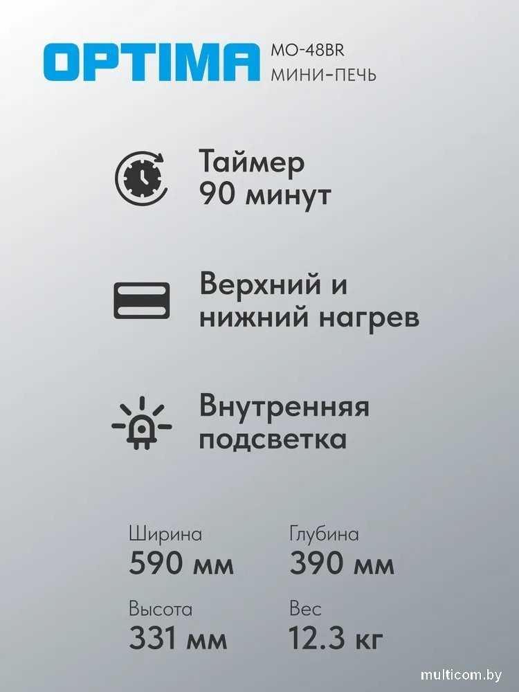| Информация | ??Текст описания составлен при помощи искусственного интеллекта. - Мини-печь Optima MO-48BR — это идеальное решение для тех, кто ценит удобство и функциональность на кухне. С объемом 48 литров и мощностью 1600 Вт, она легко справляется с приготовлением различных блюд, от запеканок до пиццы. Благодаря механическому управлению и таймеру, вы сможете точно контролировать процесс готовки. - Эта электрическая мини-печь предлагает три режима работы, включая верхний и нижний нагрев, что позволяет вам готовить блюда равномерно и быстро. Термостат гарантирует поддержание нужной температуры до 300 °C, что делает ее отличным выбором для запекания и гриля. - Освещение внутри печи позволяет следить за процессом приготовления, а стандартный эмалированный противень и круглый противень в комплекте обеспечивают удобство в использовании. Эмаль на внутренних стенках облегчает уход за устройством и предотвращает прилипание пищи. - Если вы ищете надежную и стильную мини-печь для дома, Optima MO-48BR станет отличным выбором. Ее ретродизайн добавит изюминку в интерьер вашей кухни, а компактные размеры позволят разместить ее даже в небольшом пространстве. - Не упустите возможность сделать вашу кухню более функциональной с помощью этой мини-печи, которая сочетает в себе стиль и высокую производительность! |