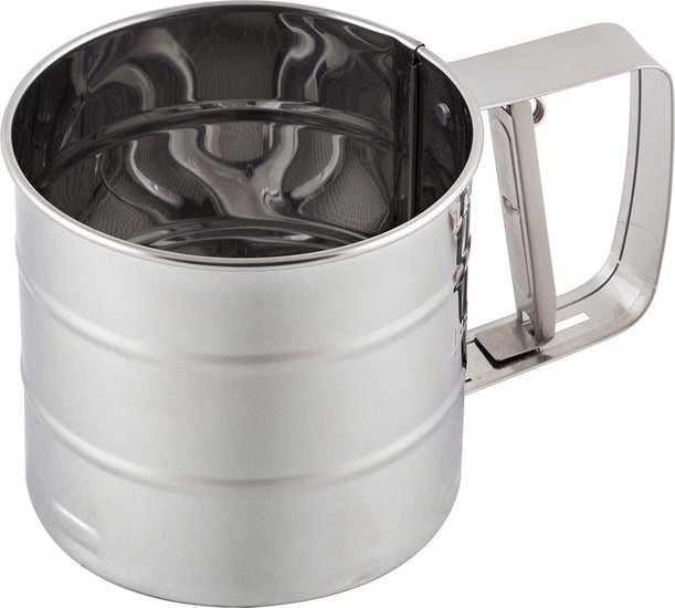 | Информация | Сито-кружка для просеивания муки понравится всем, кто любит готовить изделия из теста. С кружкой-ситом просеивание муки займет считанные секунды: в ручке кружки рычаг, при постоянном нажатии которого, внутри кружки начинают двигаться жернова, проталкивая муку через ячейки сита. Нажимайте рычаг пока кружка не опустеет, а вся мука не окажется в миске. Теперь мука готова к использованию. Изготовлена из нержавеющей стали. |