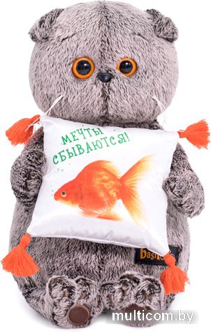 | Информация | Басик держит в лапках необычную шелковистую подушечку. На подушечке принт в виде золотой рыбки и надпись «Мечты сбываются», также на концах подушки ярко-оранжевые кисточки. |
