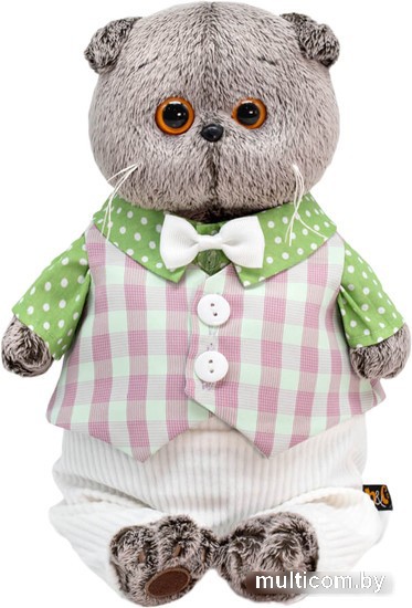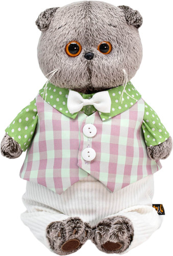 | Информация | ? Кот Басик в очаровательном костюме в светлых тонах, идеальный для встречи гостей на даче. ? В комплекте: вельветовые белые брючки, зеленая хлопковая рубашечка в белый горошек и жилет в клеточку на белых пуговицах, а также бабочка из кипенно-белой сутажной ленты. ? Подходит для спокойного отдыха за чашкой чая в приятной беседе. |