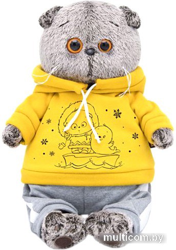 | Информация | Басик в уютном спортивном костюмчике. Модный свитшот с капюшоном цвета одуванчика из х/б футера с оригинальным принтом «Басик на севере» и штанишки из дымчатого футера с белыми лампасами. |