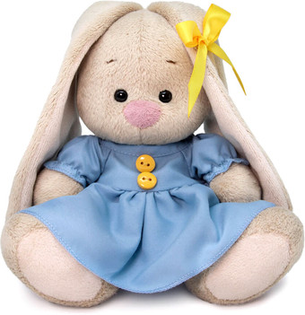 | Информация | На малышке голубое платьице с рукавом фонарик и с охристыми пуговками спереди. На ушке у Зайки желтый бантик из атласной ленты. |