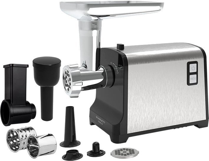 | Информация | Электрическая мясорубка Scarlett SC-MG45M33 эффективно и быстро справится с задачей любой сложности. Мощность мотора 2200 Вт обеспечивает высокую производительность – около 2.5 кг/мин. Важнейшие части и соединения сделаны из металла. Вы с легкостью приготовите кеббе и домашнюю колбасу, нашинкуете овощи для домашних заготовок, получите натертый сыр для добавления в любое блюдо. Удобным аксессуаром является толкатель с хранением, который вмещает 2 диска и насадки для кеббе и колбасы. |
