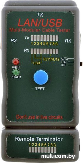 | Информация | Предназначен для тестирования телефонных, коаксиальных и кабелей на основе витых пар 5,5e и 6 кат.Область применения: обнаружение ошибок в схеме разводки, замыканий, обрывов, кросс-соединений.Типы тестируемого кабеля: UTP/STP RJ45, BNC, RJ11/12. |