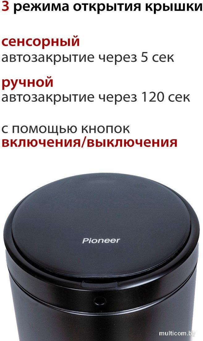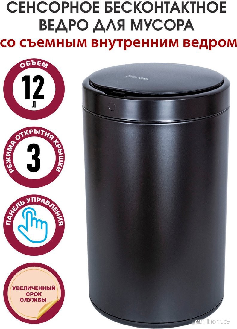 | Информация | - Сенсорное бесконтактное ведро Pioneer WB124B объемом 12 литров из прочной нержавеющей стали станет отличным выбором для вашего дома, дачи, офиса и других помещений. - В автоматическом режиме крышка ведра открывается при приближении человека на расстоянии 10-25 см благодаря инфракрасному датчику. Также ведро оснащено датчиком вибрации, который позволяет открывать крышку легким ударом ногой или рукой по корпусу. - Для удобства использования предусмотрена кнопка включения/выключения на панели, с помощью которой можно принудительно открыть или закрыть ведро. Если вы покинете зону действия датчика, крышка закроется через 5 секунд, а индикатор на сенсорной панели уведомит вас об этом. - В комплект входит съемное внутреннее пластиковое ведро, которое надежно фиксирует мусорный пакет и облегчает его извлечение. - Устройство работает от 4 алкалиновых батареек АА 1,5 В (в комплект не входят), и обычное время работы батареек составляет около 4 месяцев (3600 циклов открываний). - Лаконичный дизайн и спокойная расцветка ведра позволят ему гармонично вписаться в любой интерьер, так что прятать его не придется. |