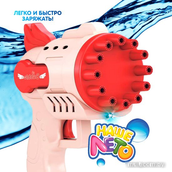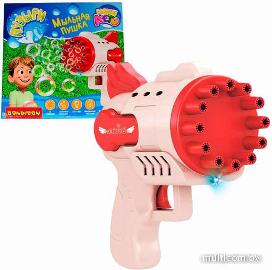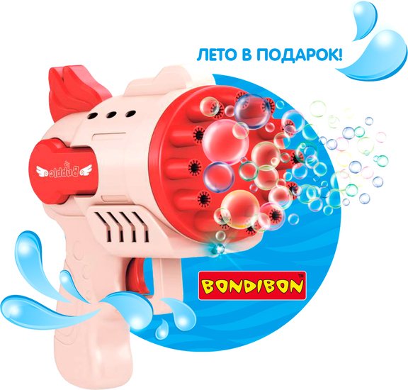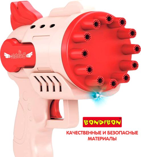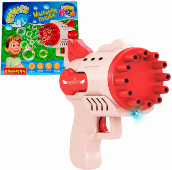 | Комплектация | - розово-красный пистолет, 12 стволов - мыльный раствор 60мл - тарелочка |