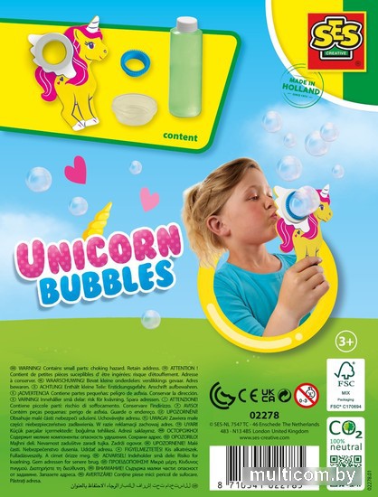 | Комплектация | раствор для мыльных пузырей, приспособление для выдувания пузырей (кольцо для выдувания пузырей, единорог), тарелочка/блюдце для мыльного раствора |