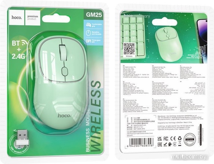 | Информация | ? Мышь Hoco GM25 - беспроводная мышь с интерфейсом подключения по радио или Bluetooth. ? Эта полноразмерная мышь с механическим переключателем и оптическим сенсором имеет максимальное разрешение 1 600 dpi. ? Изменяемое разрешение позволяет выбрать оптимальную чувствительность - 800, 1200 или 1600 dpi. ? Мышь Hoco GM25 оснащена 4 кнопками, включая дополнительные кнопки для смены разрешения, а также одним колесом прокрутки с нажатием. ? Материал корпуса и глайдов - пластик. Цвет корпуса - мятный. ?? Bluetooth версии 5.2 и 3.0 обеспечивают стабильное и быстрое подключение к устройствам. ? Эта мышь не имеет подсветки, встроенной памяти, грузов или сменных панелей, что делает ее простой и удобной в использовании для ПК. |