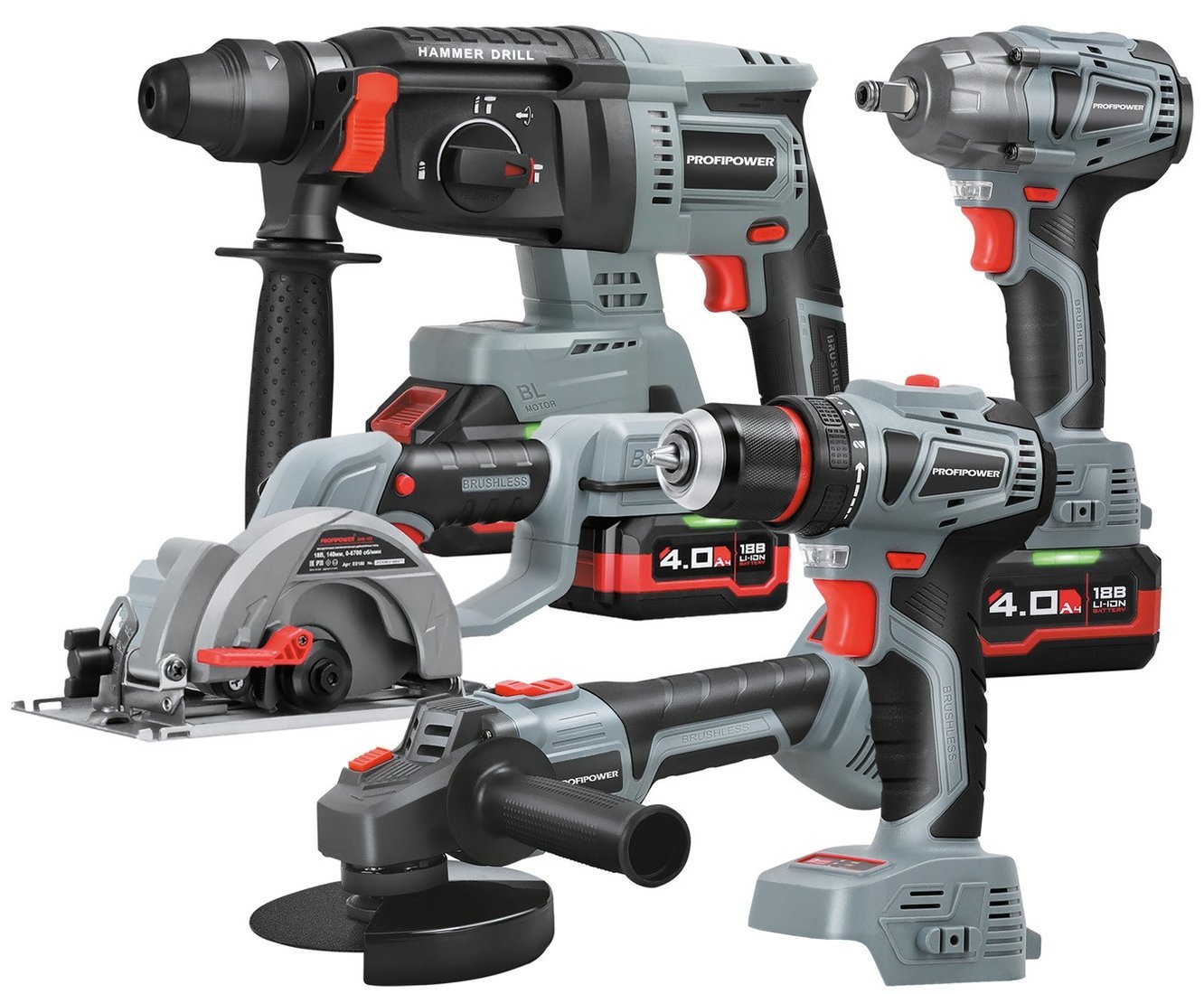 | Состав набора | гайковерт, дрель-шуруповерт, перфоратор, угловая шлифовальная машина, циркулярная пила |
