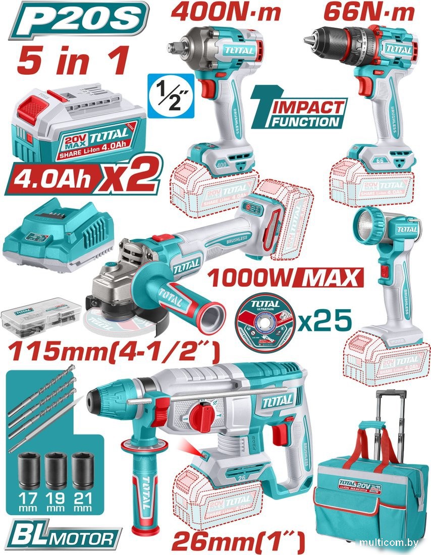 | Комплектация | - Дрель-шуруповерт ударная TOTAL TIDLI206681 - Гайковерт TOTAL TIWLI20401 - Перфоратор аккумуляторный TOTAL TRHLI20268 - Углошлифмашина аккумуляторная TOTAL TAGLI27153 - Фонарь аккумуляторный TOTAL TWLI2058 - Аккумулятор 4,0 Ач TFBLI20021 - 2 шт. - Зарядное устройство TFCLI2001 - 1 шт. - Аксессуары для дрели-шуруповерта - 47 шт. - Абразивные отрезные диски по металлу 115 мм - 25 шт. - Зубило - 1 шт. - Бур - 3 шт. - Торцевые головки (17, 19, 21 мм) - 3 шт. - Сумка |