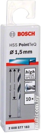 | Комплектация | Спиральное сверло из быстрорежущей стали HSS PointTeQДиаметр (D) - 1.5ммРабочая длина (L1) - 18.0мм |