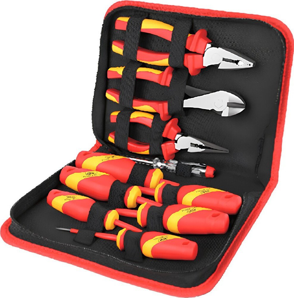 | Комплектация | 1. Индикаторная отвертка 125-250 В 2. Острогубцы с изоляцией VDE, 6 дюймов 3. Клещи для проводов с изоляцией VDE, 7 дюймов, экономящие трудозатраты 4. Диагональные плоскогубцы с изоляцией VDE, 7 дюймов 5. Отвертка Phillips с изоляцией VDE PH0х75 мм 6. Отвертка Phillips с изоляцией VDE PH1х80 мм 7. Отвертка Phillips с изоляцией VDE PH2х100 мм 8. Изолированная шлицевая отвертка VDE SL2.5х0,4х75 мм 9. Изолированная шлицевая отвертка VDE SL4х0,8х100 мм 10. Изолированная шлицевая отвертка VDE SL5.5х1х125 мм |