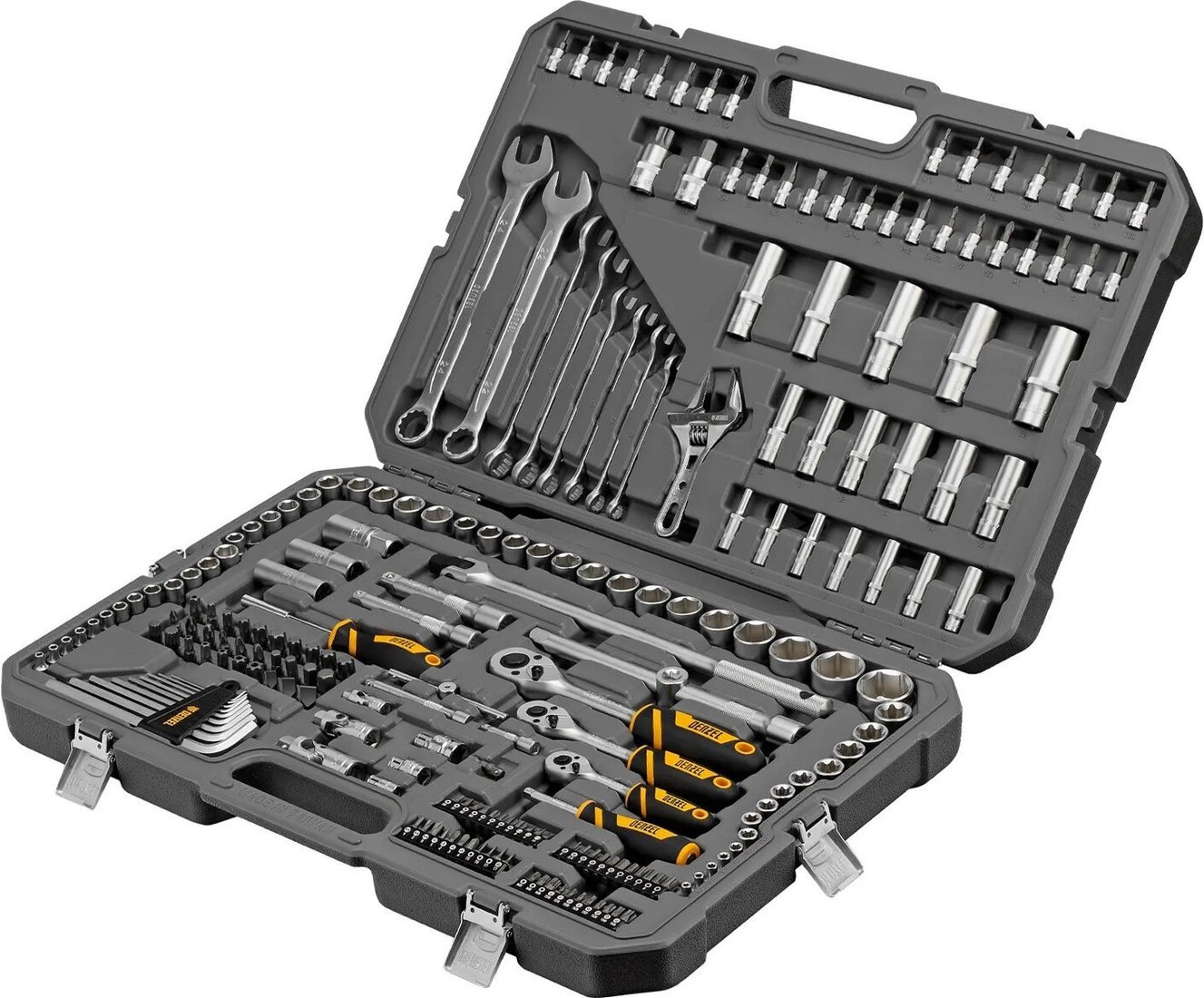 | Комплектация | Ключ-трещотка 1/4", 3/8", 1/2" 3 шт Вороток шарнирный 1/2": 380 мм 1 шт Вороток Т-образный 1/4": 115 мм 1 шт Удлинители 1/4": 50, 100 мм 2 шт Удлинитель 3/8": 125 мм 1 шт Удлинители 1/2": 125, 250 мм 2 шт Переходник для бит 1/4"-1/4" 1 шт Переходник для бит 3/8"-5/16" 1 шт Переходник для бит 1/2"-5/16" 1 шт Кардан: 1/4", 3/8", 1/2" 3 шт Ключ разводной тонкие губки: 200 мм 1 шт Отвертка-держатель 2К-рукоятка 1/4": 150 мм 1 шт Отвертка для бит 2К-рукоятка 1/4": 200 мм 1 шт Адаптер с шестигранника на квадрат 1/4"-1/4" 1 шт 3-сторонний адаптер 3/8"-1/2" 1 шт Головки торцевые 1/4" 5 шт Головки торцевые 3/8" 6 шт Головки торцевые 1/2" 3 шт Головки торцевые удлиненные 1/4" 7 шт Головки торцевые удлиненные 3/8" 6 шт Головки торцевые удлиненные 1/2 5 шт Головки торцевые 1/4" 13 шт Головки торцевые 3/8" 10 шт Головки торцевые 1/2" 14 шт Ключи имбусовые 9 шт Биты с головками 1/2" 12 шт Биты-вставки 5/16", 30 мм 30 шт Биты-вставки 1/4", 25 мм 44 шт |