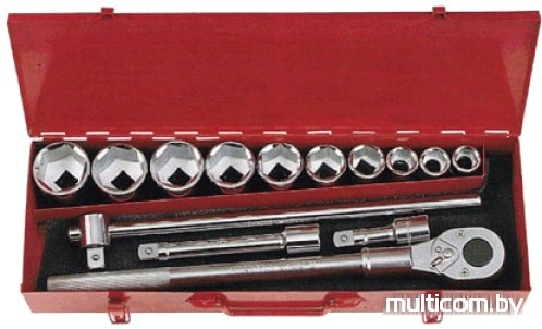 | Комплектация | Головки 6-гранные (16 шт.): 19; 21; 22; 23; 24; 26; 27; 29; 30; 32; 35; 36; 38; 41; 46; 50 мм; Трещотка (24 зуб.) L=500 мм; Вороток Т-образный L=450 мм; Удлинители (2 шт.): L=100 мм — 4"; L=200 мм — 8". |