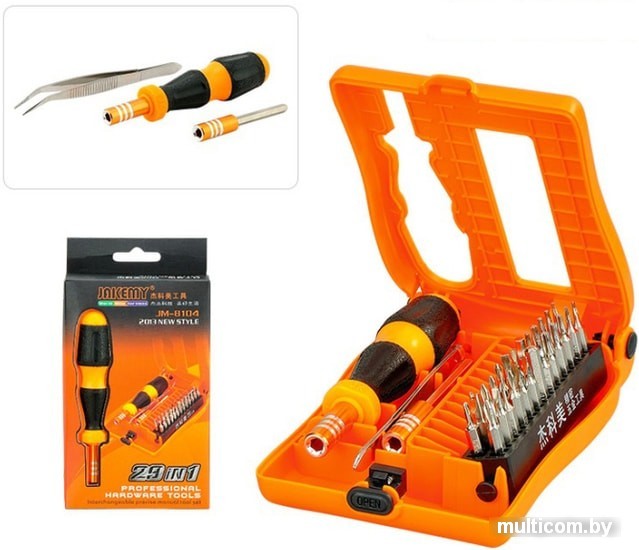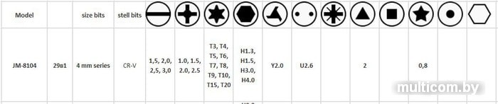 | Комплектация | Slotted: 1,5, 2,0, 2,5, 3,0Phillips: 1.0, 1.5, 2.0, 2.5Torx: T3, T4, T5, T6, T7, T8, T9, T10, T15, T20Hex: H1.3, H1.5, H3.0, H4.0Tri-wing: Y2.0U-shaped: U2.6Triangle: 2Pentalobe (star): 0,8- удлинитель;- отвертка под биты;- пинцет. |