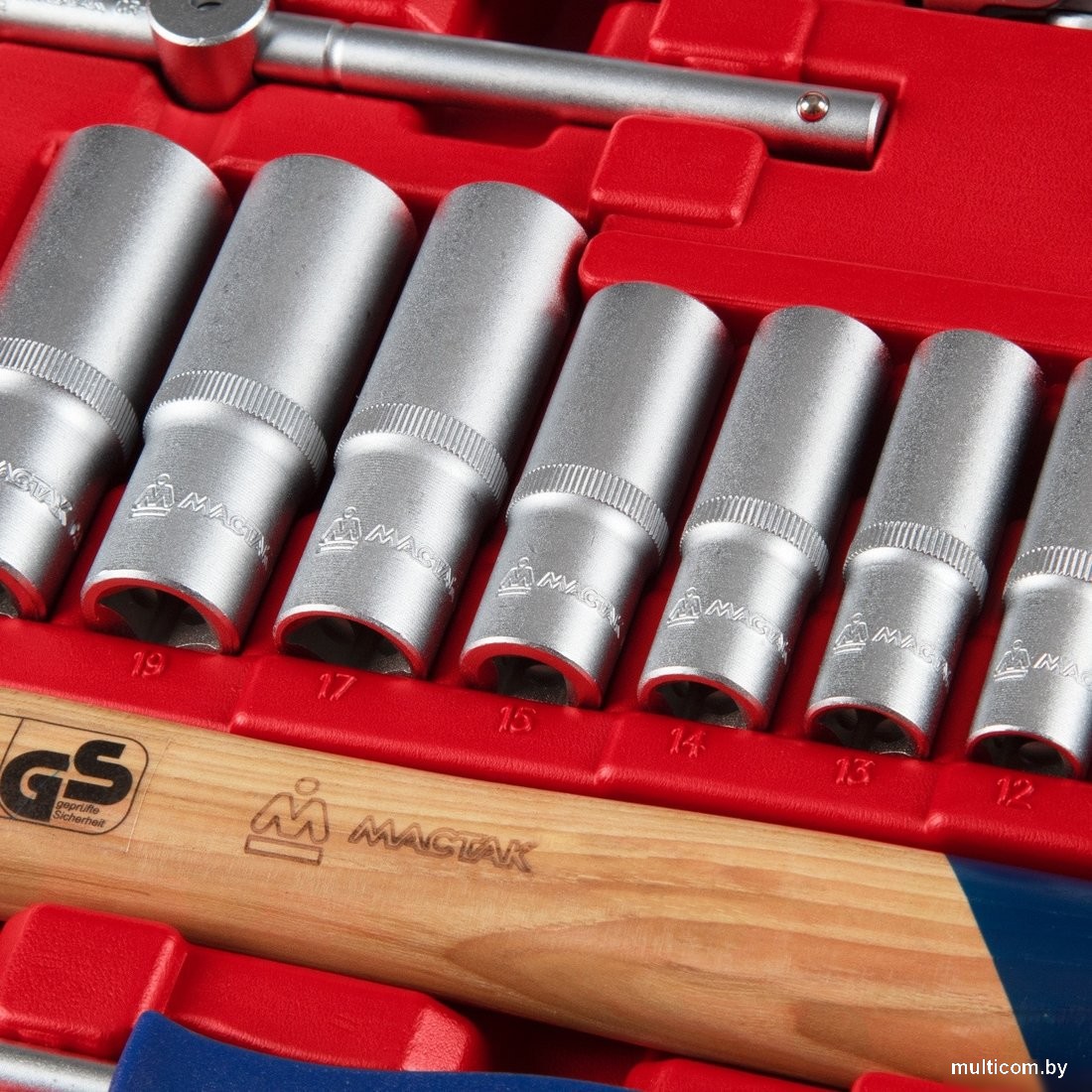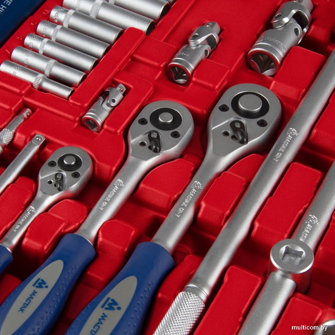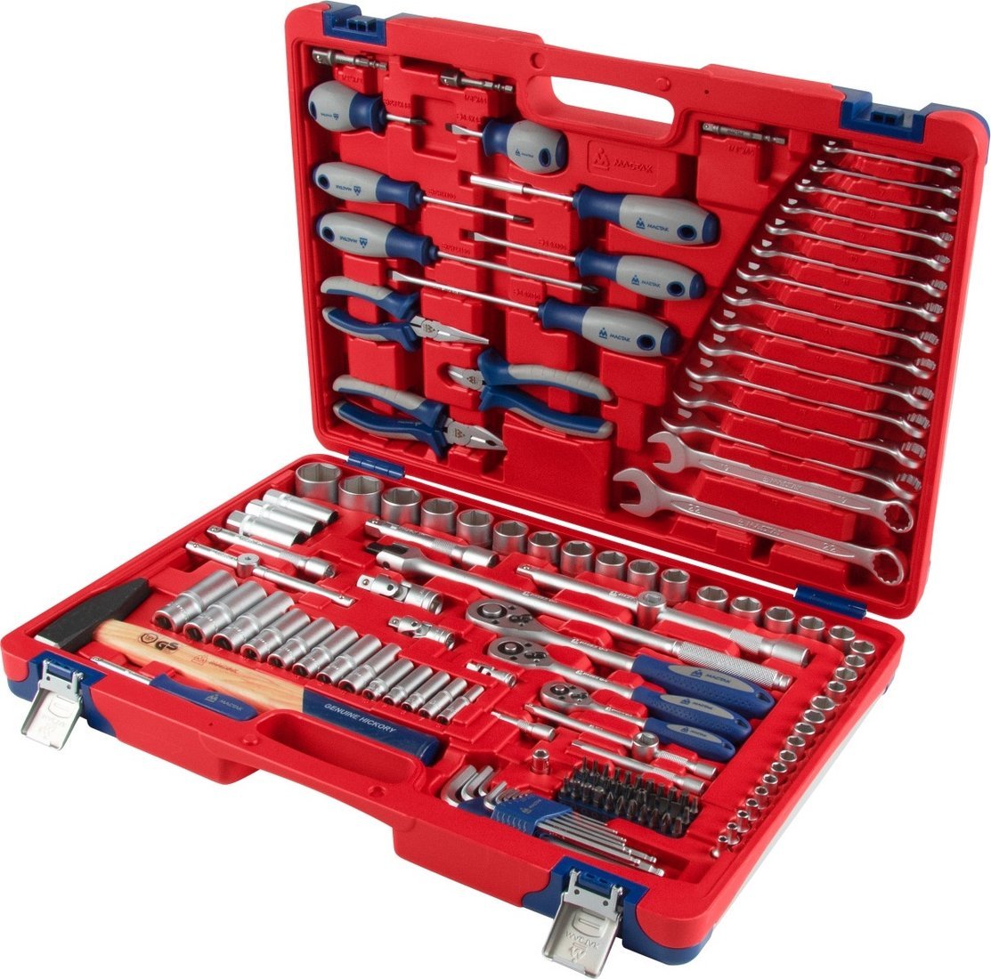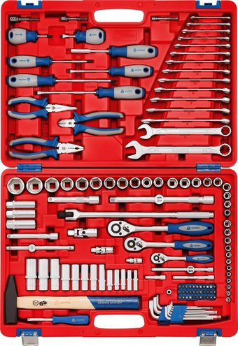 | Комплектация | Головки и принадлежности 1/2", 3/8", 1/4"; Вставки (биты) 1/4" 25 мм; Адаптеры под шуруповёрт; Ключи; Отвёртки; Шарнирно-губцевый инструмент; Вспомогательный инструмент; Кейс |
