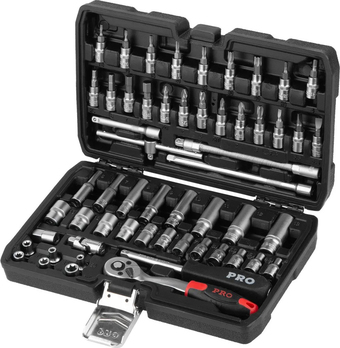 | Информация | Набор инструментов 1/4" 6 граней 56 предметов PRO STARTUL Stuttgart (PRO-056S) - многофункциональный набор, предназначенный для ремонта и обслуживания автомобиля, а также для выполнения других слесарных работ. Рабочие части изготовлены из хромованадиевой стали, устойчивы к коррозии. Финишная обработка головок: сатинирование. Профиль головок: шестигранный. Трещоточный механизм: 72 зуба. Кейс выполнен из прочного противоударного пластика, с металлическими замками. |