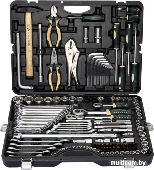 | Комплектация | - головки 1/4"короткие шестигранные 25 мм: 4, 4.5, 5, 5.5, 6, 7, 8, 9, 10 мм;- головки 1/4"Е-профиль 25 мм: Е4, Е5, Е6, Е7, Е8;- биты 5/16"HEX 30 мм: 7, 8, 10, 12, 14 мм;- биты 5/16"TORX 30 мм: T30, Т40, Т45, Т50, Т55, Т60;- биты 5/16"SL 30 мм: 8, 10, 12 мм;- биты 5/16"SPLINE 30 мм: М5, М6, М8, М10, М12;- бита 5/16"РН 30 мм: РН.2, РН.3, РН.4;- бита 1/4"PZ 25 мм PZ.2, PZ.3, PZ.4;- трещотка 1/4";- рукоятка 1/4"145 мм;- удлинители 1/4"50, 100, 150 мм;- гибкий удлинитель 1/4"150 мм;- кардан шарнирный 1/4"; - головки 3/8"короткие 12-гранные 28 мм: 6, 7, 8, 9, 10, 11, 12, 13, 14, 15, 17, 18, 19, 21, 22 мм;- трещотка реверсивная шарнирная 3/8";- удлинители 3/8": 75, 150 мм;- кардан щарнирный 3/8";- головки 1/2"короткие шестигранные 38 мм: 8, 10, 12, 13, 14, 15, 16, 17, 18, 19, 21, 22, 23, 24, 25, 27, 30, 32, 36 мм (12-гранные: 27, 30, 32, 36 мм; усиленные: 17, 19, 21 мм);- головки 1/2"Е-профиль 38 мм: Е10, Е12, Е14, Е16, Е20;- головки свечные 1/2"16, 21 мм;- трещотка 1/2";- вороток 1/2"Г-образный 260 мм;- вороток шарнирный 1/2"430 мм;- удлинители 1/2"75, 250 мм;- кардан шарнирный 1/2";- переходник усиленный с 3/8"(F)*1/2"(M) с отверстием;- переходник усиленный с 3/8"(F)*1/4"(M) с отверстием;- битодержатель 1/2"(F)*5/16"(F) (HEX);- ключи шестигранные Г-образные: 2.5, 3, 4, 5, 6, 7, 8, 10, 12, 14 мм;- ключи разрезные: 8*10, 10*12, 11*13, 12*14, 17*19;- ключи трещоточные накидные: 8*10, 12*13, 14*15, 16*17, 18*19 мм;- ключи комбинированные рожково-накидные: 6, 7, 8, 9, 10, 11, 12, 13, 14, 15, 16, 17, 18, 19, 21, 22, 24 мм;- отвертки крестовые PН.1*40 мм, PH.2*150 мм;- отвертки шлицевые SL.5.5*40мм, SL.6.5*100 мм;- отвертки силовые: PH.2*100 мм, SL.6.5*150 мм;- плоскогубцы 7"175 мм; бокорезы 7"175 мм;- захват гейферный 10"250 мм;- молоток с деревянной ручкой 300 гр. |