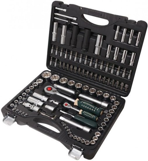 | Комплектация | головки 1/4"короткие 25 мм: 4, 4.5, 5, 5.5, 6, 7, 8, 9, 10, 11, 12, 13, 14 мм; головки 1/4"глубокие 50 мм: 6, 7, 8, 9, 10, 11, 12, 13 мм; головки 1/4"Е-профиль короткие 25 мм: Е4, Е5, Е6, Е7, Е8; головки-биты 1/4"HEX 35 мм: 3, 4, 5, 6 мм; головки-биты 1/4"TORX 35 мм: T8, T10, T15, T20, T25, Т27, T30; головки-биты 1/4"SL 35 мм: 4, 5.5, 6,5; головки-биты 1/4"РН 35 мм: РН.1, РН.2; головки-биты 1/4"PZ 35 мм: PZ.1, PZ.2; трещотка 1/4"; рукоятка 1/4"150 мм; вороток Т-образный 1/4"115 мм; удлинители 1/4"50, 100 мм; кардан шарнирный 1/4"; биты 5/16"HEX 30 мм: 7, 8, 10, 12, 14 мм; биты 5/16"TORX 30 мм: Т40, Т45, Т50, Т55, Т60; биты 5/16"SL 30 мм: 8, 10, 12; биты 5/16"PH 30 мм: PH.3, PH.4; биты 5/16"PZ 30 мм: PZ.3, PZ.4; головки 1/2"короткие 38 мм: 10, 11, 12, 13, 14, 15, 16, 17, 18, 19, 20, 21, 22, 24, 27, 30, 32 мм (усиленные на 17, 19, 21 мм); головки 1/2"глубокие 77 мм: 14, 15, 17, 19, 22 мм (усиленные на 17, 19 мм); головки 1/2"Е-профиль короткие 38 мм: Е10, Е11, Е12, Е14, Е16, Е18, Е20, Е24; головки свечные 1/2": 16, 21 мм; трещотка 1/2"; удлинители 1/2": 125, 250 мм; кардан шарнирный 1/2"; адаптер усиленный с отверстием с 3/8"(F)*1/2"(M) ; битодержатель 1/2"(F)*5/16"(F); 6 гранники Г-образные короткие: 1.5, 2, 2.5 мм. Пластиковый кейс с металлическими защелками. |