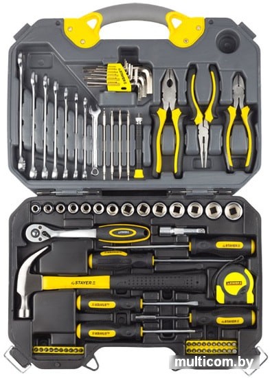 | Комплектация | - Комбинированные ключи, 8 шт.- Трещотка 3/8"- Удлинитель 3/8"- Битодержатель с двухкомпонентной рукояткой 1/4"- Торцовые головки 3/8", 14 шт.- Биты, 30 шт.- Отвертки с двухкомпонентной рукояткой, 4 шт.- Имбусовые ключи, 9 шт.- Бокорезы- Длинногубцы- Плоскогубцы комбинированные- Ручка для прецизионной отвертки- Двухсторонние жала для прецизионной отвертки, 4 шт.- Рулетка- Молоток-гвоздодер с фибергласовой рукояткой |