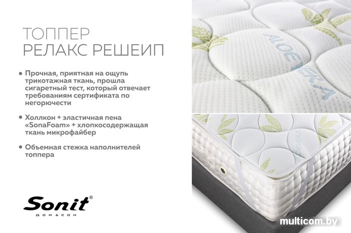| Информация | Топпер Релакс Решейп предназначен для использования на раскладном/не раскладном диване, где есть неровности, перепады или стыки спального места, а также для матраса, для защиты и создания дополнительного комфорта.Описание:наполнение: холлкон + эластичная пена Sonafoam + хлопкосодержащая ткань микрофайбер;прочная, приятная на ощупь трикотажная ткань (производитель «BekaertDeslee», Бельгия), прошла сигаретный тест, который отвечает требованиям сертификата по негорючести;объемная стежка наполнителей топпера по технологии SonRichQult;окантовка по периметру отделочной лентой;-эластичная лента по краям топпера для фиксации; |