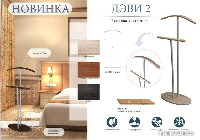| Информация | Металлическая стойка костюма Дэви 2 с элементами из натурального дерева. Простая, изящная, надежная конструкция без излишеств. Устойчивая и легко собирается. |