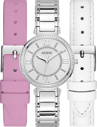 | Информация | A watch wardrobe that gives you the versatility of a bracelet, silicone strap as well as an ethically sourced leather with ultra-suede backing that are all interchangeable on this great fully glitz crystal look with a dressed up 3H dial. This style ships in packaging. |