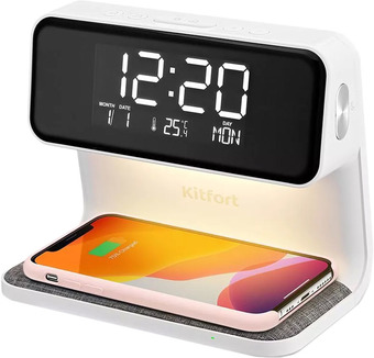 | Информация | Настольные часы КТ-3351 выполняют сразу несколько функций: показывают время, дату, день недели, температуру, могут служить будильником и светильником. Благодаря встроенной беспроводной зарядке, можно с лёгкостью заряжать телефон или другие устройства. На настольных часах вы можете установить 2 будильника. Сигнал будильника можно отложить или отключить. Время отложенного сигнала настраивается от 5 до 30 минут с шагом 5 минут. Для зарядки телефонов, часов и других устройств, необходимо положить гаджет в центр зоны беспроводной зарядки. Беспроводная зарядка работает по протоколу Qi. Благодаря стильному дизайну и компактному размеру настольные часы легко впишутся в ваш интерьер. Кнопкой «Часы» вы можете настроить время и дату, а также будильник. Кнопка «Будильник» переключает отображение текущего времени и будильников. Кнопками «+» и «-» можно настроить значение времени или будильника в часах и минутах. Яркость дисплея и подсветки настраивается, что очень удобно. Кнопка «Подсветка» - циклически переключает 3 уровня подсветки и выключает её. Кнопкой «Отложить сигнал будильника» вы также можете выбрать 1 из 3-х уровней яркости подсветки дисплея. В комплектации с часами идёт блок питания и батарейка CR2032, чтобы при отключении от источника питания, заданные вами настройки не сбились. |