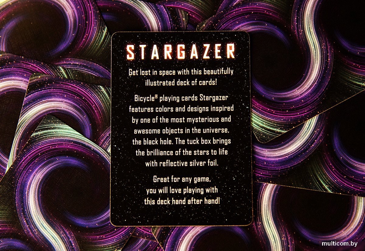 | Информация | - Погрузитесь в загадочный мир космоса с колодой карт Bicycle Stargazer! Эти игральные карты созданы для тех, кто ценит уникальный дизайн и атмосферу галактики. Вдохновение для их оформления пришло от черных дыр — одних из самых таинственных объектов во Вселенной. - Коробка колоды выполнена из прочного картона, а элементы дизайна дополнительно украшены фольгой, что придает ей особую элегантность. На обратной стороне коробки изображены две зеркально отраженные черные дыры, окруженные газопылевыми кольцами, которые образуют символ бесконечности — идеальное отражение бескрайних просторов космоса. - Джокеры в этой колоде выглядят как галактические путешественники, которые приветствуют вас одной рукой, а в другой держат устройство, напоминающее волшебный жезл со звездой на конце. Несмотря на схожесть, каждый джокер уникален благодаря инверсии цвета, что добавляет интересный визуальный эффект. - Эти карты идеально подойдут как для игры, так и для коллекционирования, привнося в ваш досуг атмосферу космических приключений. |