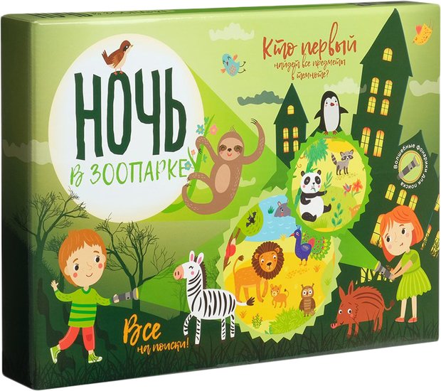 | Информация | Ночь в зоопарке – увлекательная игра для детей и взрослых. Отправляйтесь в ночной зоопарк с настольной игрой из серии «Интересный мир»! В наборе вы найдете целых 100 карточек с предметами, специальное игровое поле и 2 фонарика. «Светите» фонариком в «темноту», опередите соперника и найдите всех животных в ночном зоопарке. Кто первым найдет льва? Кто проверит, спит ли белка? А кто сможет перечислить всех животных на букву «к»? Набор помогает развить внимание и сообразительность. Это необычный подарок и увлекательная игра для детей и взрослых. |