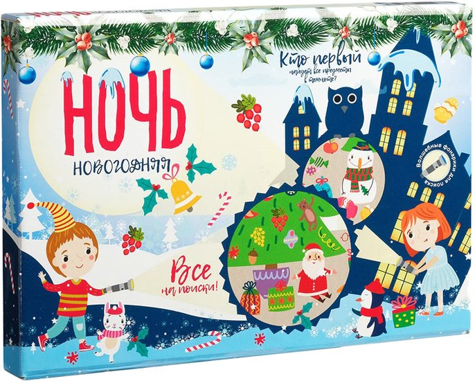 | Информация | Новогодняя ночь – увлекательная настольная игра для детей и взрослых, а также лучший подарок под новогоднюю елочку! В наборе вы найдете целых 100 карточек с предметами, специальное игровое поле с эффектом «темноты» и 2 фонарика из картона. «Подсвечивайте» игровое поле, чтобы опередить соперника и первым находить предметы в темноте. Кто первым отыщет подарки? Кто быстрее рассмотрит все красные предметы в комнате? А все предметы на букву «м» или круглой формы? Цель на новогоднюю ночь – найти всё! Игра поможет развить внимание, сообразительность и ловкость. Это оригинальный подарок и замечательное развлечение для детей. |
