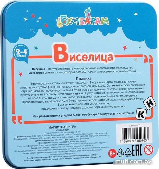| Информация | Виселица — популярная игра, цель которой угадать слово, загаданное «палачом» и тем самым спасти монстрика. «Палач» придумывает слово и размещает на игровом поле пустые фишки — по одной на каждую букву загаданного слова. Остальные игроки по очереди пытаются отгадать выбранное слово. Если буква угадана правильно, она заменяет пустую фишку. Если нет — «палач» начинает строить из деталей сначала виселицу, а затем монстрика. |