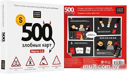 | Информация | В чём отличие от версии 2.0?В коробке по-прежнему 500 карточек: прикольные заходы и забавные варианты ответов. В выпуске 3.0 — новые злобные карточки. Авторы взяли свежие трешовые темы и прокатились на популярных мемах (ничего святого у людей!).Предельно простые правилаВедущий (а им становятся все игроки по очереди) зачитывает с красной карточки фразу с пропуском. Например: «_____ помогает мне защищаться от хулиганов» или «На Луне можно найти две вещи: мячики для гольфа и _____» (да-да, мы смогли выбрать для вас приличные примеры). А все остальные игроки стараются выбрать из своих белых карточек ту, фраза на которой лучше всего подойдет под запросы ведущего.Белые карточки выкладываются так, чтобы ведущий не знал, где чья. Теперь его задача — зачитать все варианты, отсмеяться и выбрать самый лучший — то есть решить, кто из игроков получит очки, а кто нет. |