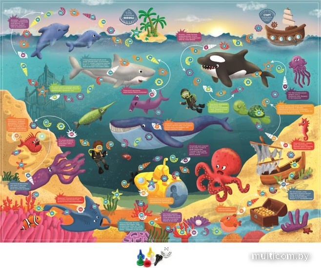 | Информация | Надевай маску и акваланг и погружайся на самое дно океана! Тебе предстоит знакомство с гигантским спрутом, кальмарами и необычными рыбами. Ты узнаешь, зачем удильщику светящийся плавник-удочка, сколько времени нужно для рождения жемчужины, почему морская черепаха никогда не сбивается с курса, а также многое другое. |