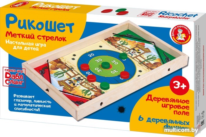 | Информация | Сразитесь с соперником в увлекательной активной настольной игре Рикошет «Меткий стрелок»! Запускай фишки, регулируй силу броска, набери больше очков! Сначала игроки договариваются о количестве раундов для каждого варианта состязаний. Методом жеребьевки определяют право выбрать цвет фишек и очередность. У соперников по 3 фишки. Используя натяжение резинки, игроки регулируют «полет» фишки, стремясь получить максимальное количество очков. Во всех вариантах игры пользуются едиными правилами подсчета очков в зонах поля. Фишка попала в зону с указанием очков - игрок начинает их подсчет. Фишка попала за пределы мишени - ноль очков. Если фишка попадает в спорные зоны поля, то игроку засчитываются очки той зоны, на которой расположена большая часть фишки. Результаты «полета» трех фишек суммируют. Выигрывает тот, кто по итогам раундов набрал больше очков. |