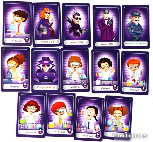 | Комплектация | • карточки – 14 шт. (5,5 х 8,5 см) • правила игры Игра предназначена для детеи? 6–12 лет и их родителеи? и рассчитана на 3–15 участников. В комплект игры входят следующие карты: • начальник охраны – 1 шт. • шпионы – 3 шт. • координатор (главный шпион) – 1 шт. • учёные – 9 шт. |