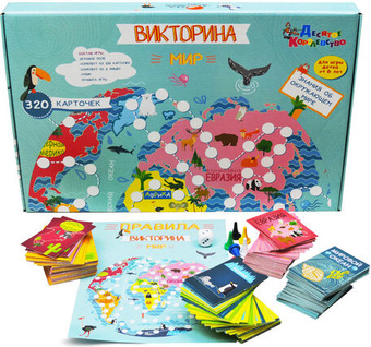 | Комплектация | - игровое поле – 1 шт. (59 х 44,5 см) - карточки с вопросами и ответами – 320 шт. (4,5 х 6,5 см) - фишки разноцветные (красная, жёлтая, белая, синяя, зелёная, чёрная) – 6 шт. (2 см) - кубик (1,5 х 1,5 см) - правила игры |