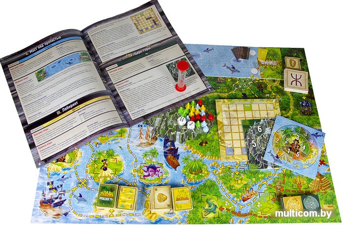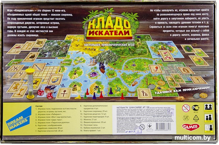 | Комплектация | Игровое поле, поделенное на 4 местности: джунгли, острова, пустыня, лес —1 шт.Игровое поле для игры «Лабиринт» —1 шт.Игровое поле для игры «Каменная ловушка» —1 шт.Игровое поле для игры «Старый причал» —1 шт.Игровое поле для игры «Царь горы» —1 шт.Игровое поле для игры «Пиратская рулетка» —1 шт.Игровое поле для игры «Камни мудрости» —1 шт.Карточки с изображением индейских символов — 40 шт.Карточки опасностей — 28 шт. (испытания (мини-игры) 12 шт., ловушки – 12 шт., пустые карточки – 4 шт.)Карточки предметов-помощников – 4 шт.Карточки дополнительных предметов – 4 шт.Карточки сокровищ – 50 шт. (42 очка – 4 шт., 30 очков – 9 шт., 20 очков – 8 шт., 10 очков – 8 шт., 5 очков – 6 шт., 1 очко – 15 шт.)Квадрат для игры «Амулет» (разрезается на 7 геометрических фигур) –1 шт.Деревянные перегородки – 8 шт.Фишки – 40 шт. (по 10 на каждый цвет: синий, красный, желтый, зеленый)Песочные часы (1 минута) –1 шт.Деревянная шайба –1 шт.Кубики –5 шт.Книга правил –2 шт. |