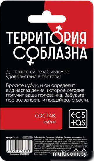 | Информация | За гранью наслаждения! Ночь — время воплощения самых смелых желаний, и неоновый кубик вам это докажет. Скорее бросайте его и поддавайтесь искушению. Посмотрите, какой вид наслаждения выпал на грани. Именно эти ласки и получит ваша половинка сегодня ночью! Каждая девушка мечтает о таком подарке! Внутри вы найдёте 1 неоновый кубик. Сделайте вашу ночь ярче! |